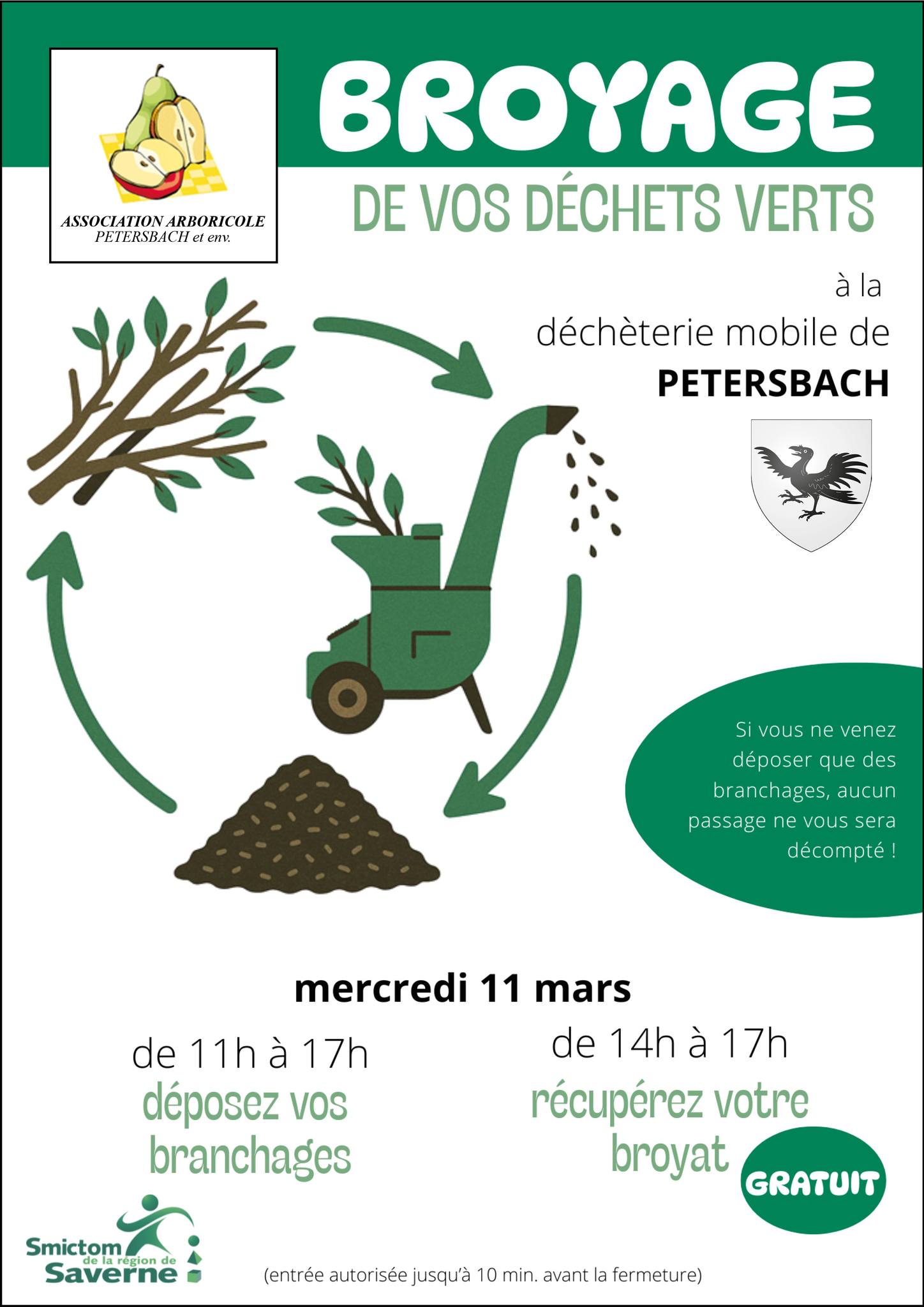 Le Smictom de la région de Saverne , en partenariat avec l’association arboricole, vous propose une opération broyage de vos branchages à la déchèterie mobile de Petersbach.